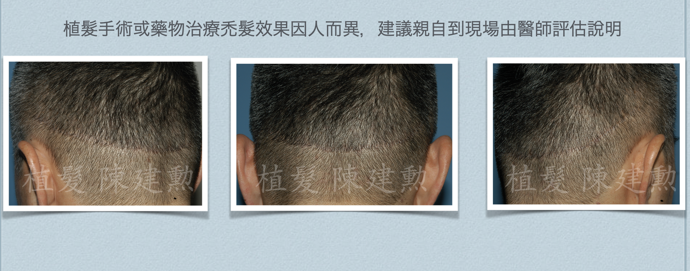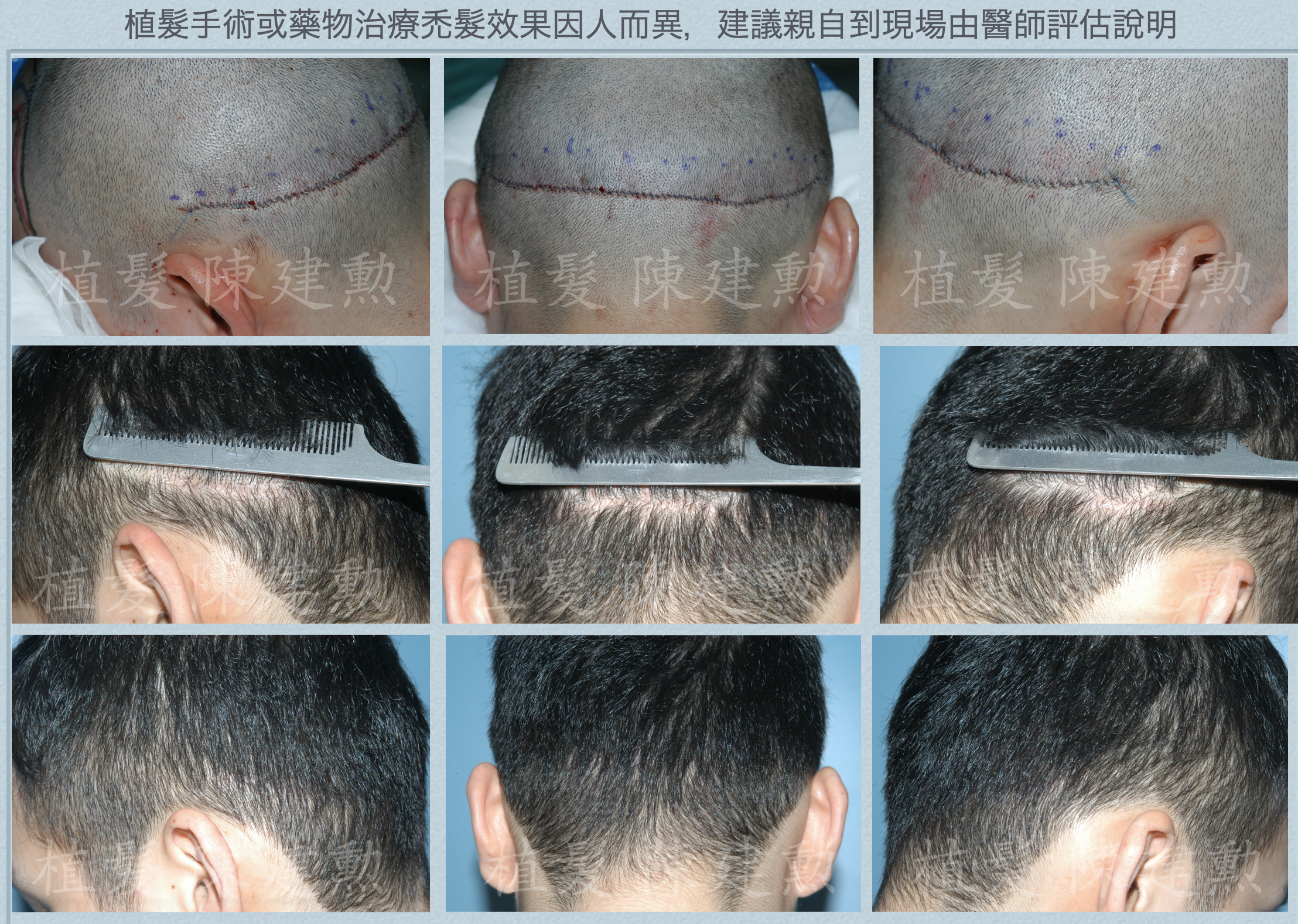 當然如果頭皮比較緊繃的病人可能會出現比較寬的疤痕3~5mm,或者是在局部頭皮比較緊的部位局部出現大於1〜2mm寬的疤痕,最常見的是靠近耳朵附近的頭皮。