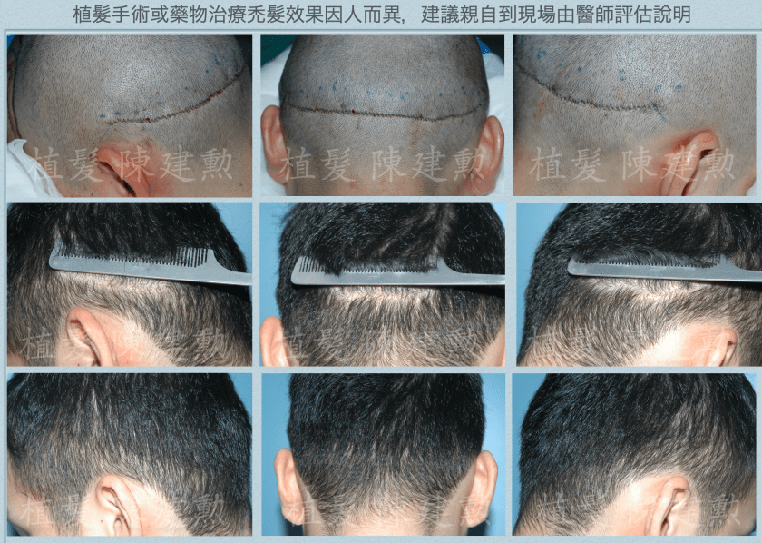 ②頭皮比較緊繃的病人或是局部(靠近耳朵附近)相對容易產生>1~2mm的疤痕