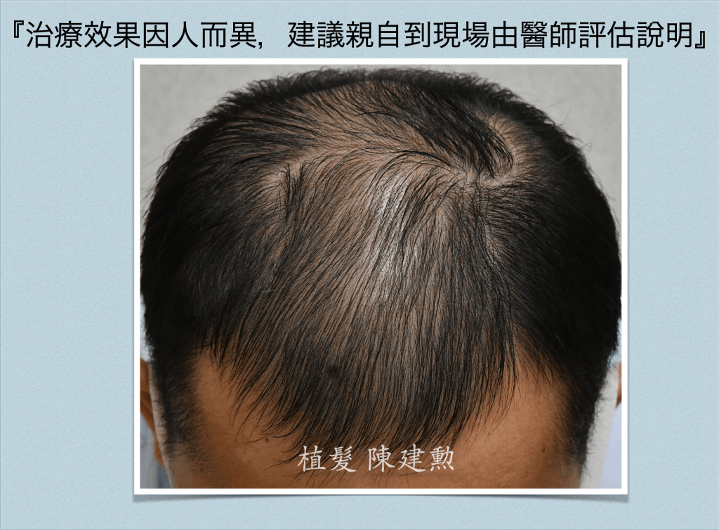 至少先撐著,不一定會增加,但至少先求穩定不要惡化。至少在一開始的時間點是這樣想沒錯,植髮當然是很優秀,很立竿見影的好方法來增加髮量,但是考量病人的年齡,手術範圍,次數,費用,最後決定還是先穩住陣腳再說。