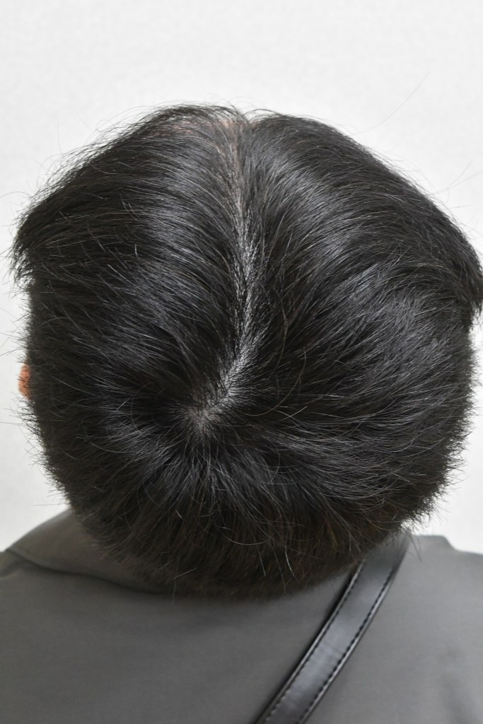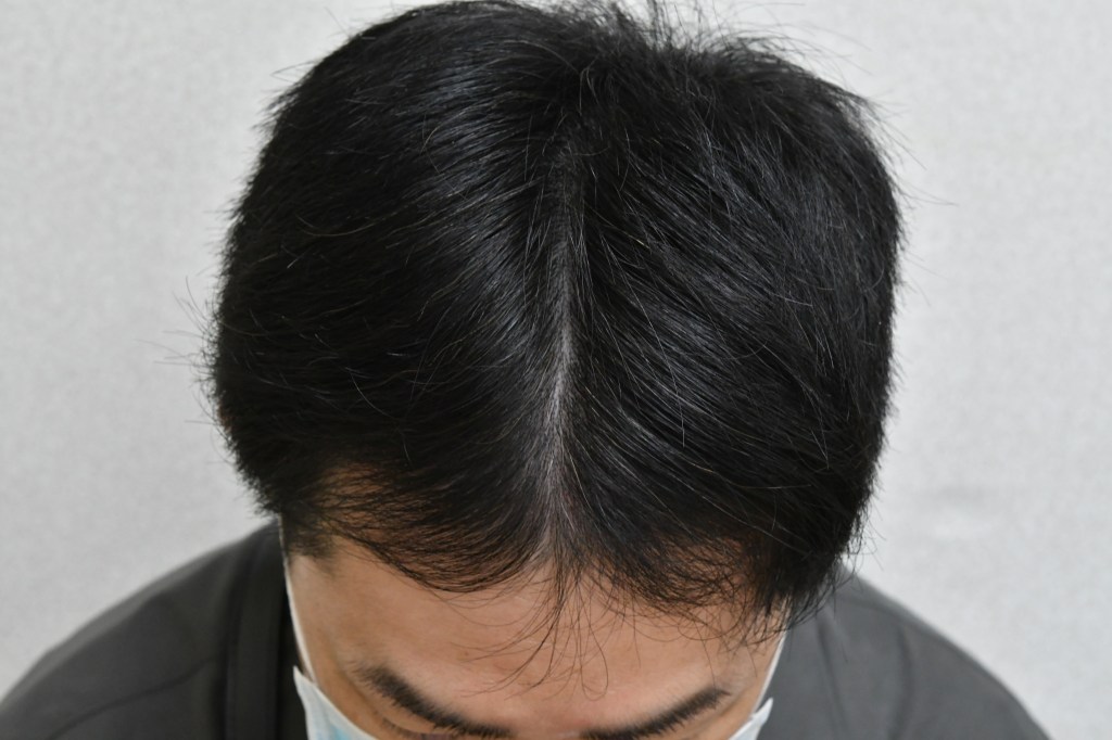這病人只是稍微稀疏一點,不是很容易看,不過只要特別留意一下梳開頭髮時露出來的頭皮空隙就知道其實已經開始禿頭了。